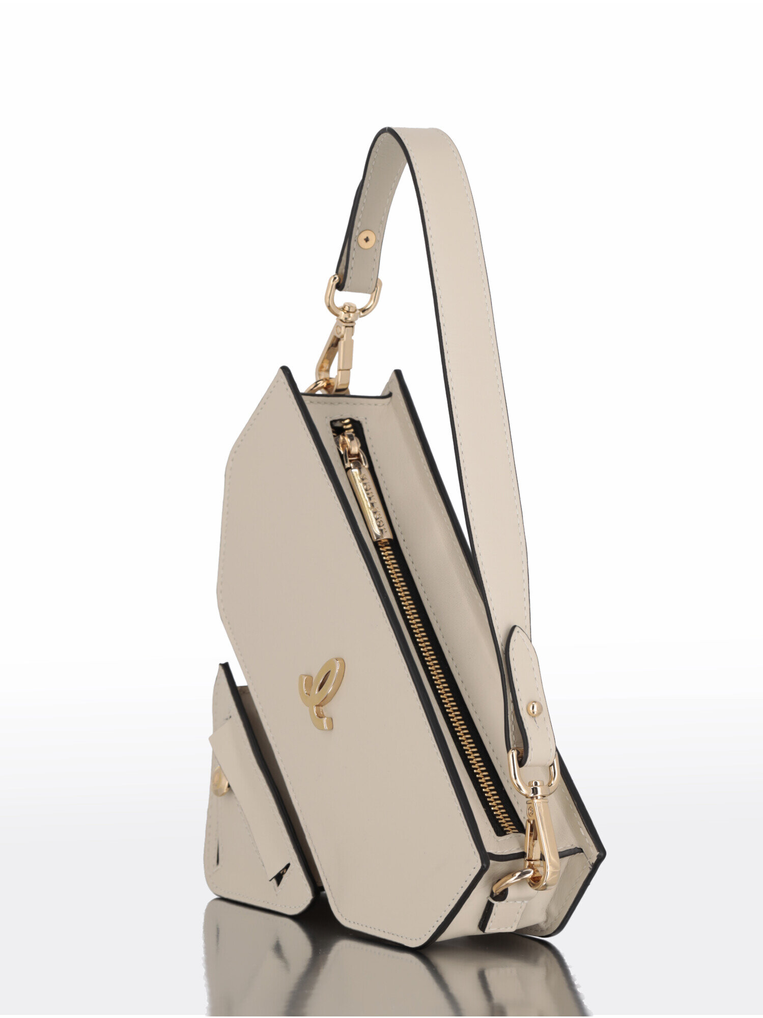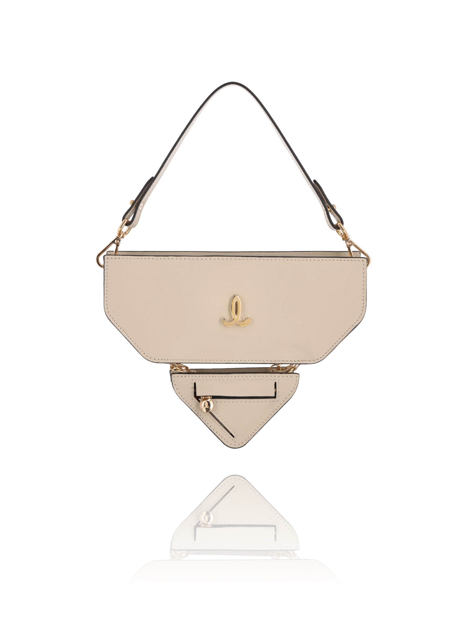 El bolso Diman, confeccionado a mano en piel de becerro, con un refuerzo rígido, presenta una silueta triangular.